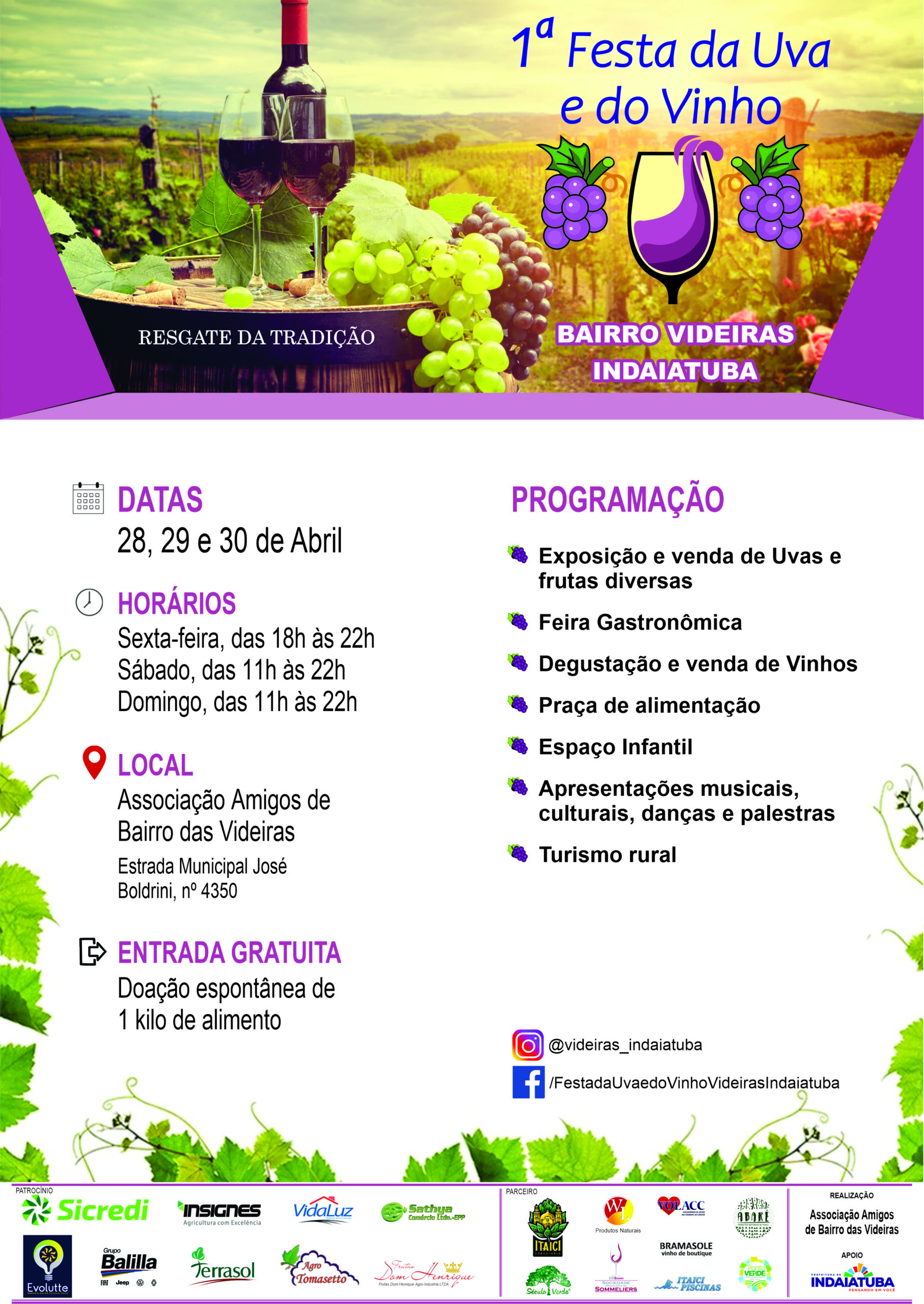 Resgatar as tradições de um bairro essencialmente agrícola e muito importante para a história de Indaiatuba é uma das missões da 1ª Festa da Uva e do Vinho, que ocorre em Videiras. A festa acontece nos dias 28, 29 e 30 de abril, com exposição e venda de uvas e frutas diversas, feira gastronômica, degustação/venda de vinhos, praça de alimentação, apresentações musicais e culturais, espaço kids, palestras, turismo rural e exposições. O evento, organizado pela Associação Amigos de Bairro das Videiras, com apoio da Prefeitura de Indaiatuba e patrocinadores, tem entrada gratuita, mas você pode doar 1kg de alimento não-perecível.